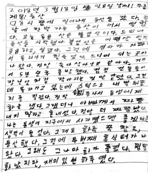 8시쯤에 일어나서 등산을 갔다. 한 달에 한 번 가는 등산이어서 설랬다. 오늘 올을 산은 불암산이다. 드디어 등산을 시작했다. 불암산은 어떤 산인지 궁금하고, 설랬다. 그런데 경사가 가파라서 올라가기 힘들었다. 드디어 쉬는 곳이 나왔다. 정말 죽다 살아난 것 같아다. 거기서 5분 쉰 후 출발했다. 점점 건물들이 장남감처럼 작아지는 것만 같았다. 그런데 올라가고 있는데 동생이 스틱으로 내 발뒤꿈치를 질렀다. 정말 짜증이 나서 동생에게 화를 냈다. 그랬더니 아빠께서 짜증내지 말라고 혼내셨다. 정말 더 짜쯩났다. 나는 동생이 지구에서 사라졌으면 좋겠다는 생각이 들었다. 그래도 화를 꾹 참고, 등산했다. 그런데 두 번째 휴식터가 나왔다. 그래도 그나마 화가 풀렸다. 정말 화났지만, 재미있는 하루였다.