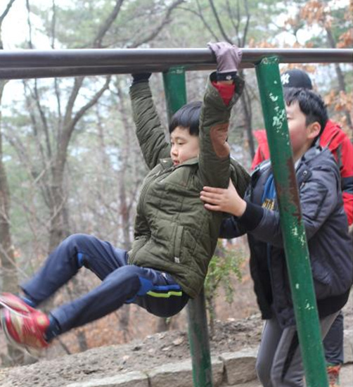 한결이의 짜증이 풀리지 않은 상태에서 도착한 약수터. 어른들이 평행봉을 하니 아이들도 따라하며 즐거워한다.