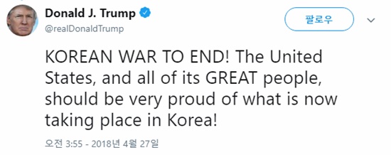 김 위원장과의 만남을 앞둔 도널드 트럼프 미국 대통령은 ‘판문점 선언’ 발표 직후 환영 트윗을 올렸다. “한국전쟁은 끝날 것이다! 미국과 모든 위대한 국민들은 지금 한국에서 일어나는 일을 매우 자랑스러워해야 한다!”