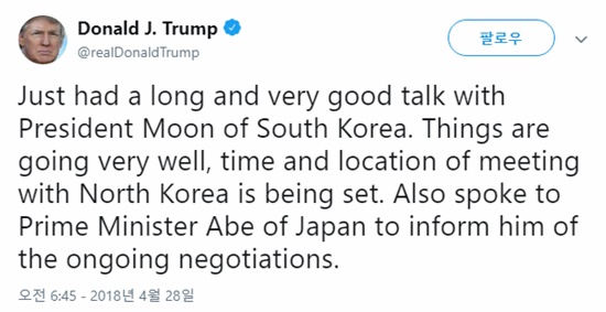 이에 앞서, 트럼프 대통령은 별도 트윗을 통해 “방금 남한 문 대통령과 아주 길고 매우 좋은 통화를 했다”면서 “일이 아주 잘 되어가고 있고, 북한 (김정은 위원장과의) 회담 시간과 장소가 잡히고 있다”고 알렸다.