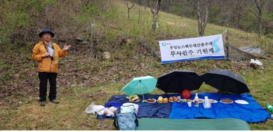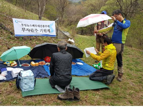 | 통일뉴스 백두대간 종주대 2018년 시산제 축문 2018년 무술년 4월 22일 오늘 통일뉴스 백두대간 종주대원들은 백두대간의 정기가 용솟움한 성스런 영봉 속리산 천왕봉 아래에 엎드려 삼천리 금수강산을 굽어보시며 우리 민족의 길흉화복을 주관하시는 천지신명께 대원 모두의 무탈함에 무한한 감사의 예를 올리옵고 앞으로의 행보를 엄숙히 고하나이다. 평화와 통일의 염원을 담아 지리산 자락 고기리에서 첫 발을 내딛은 통일뉴스 백두대간 종주대의 지난 1년은 장엄한 백두대간의 존엄과 숭고한 사랑을 온 몸과 마음으로 받아들이는 경건한 순례의 길이었습니다. 백두대간 마루금에서 발원한 생명수는 산자락과 너른 들판에 겨레의 삶터를 마련해 주었으며, 골짜기와 봉우리, 수많은 고개마다 민족의 정기와 정신은 아름다운 서사와 서정이 깃든 이름으로 살아 숨 쉬고 있었습니다. 그러나 또 한편 분단의 비극으로 백두대간 곳곳엔 민족상잔의 깊은 상처가 아물지 않은 채 분열과 치유되지 않은 고통으로 남아있었으며, 탐욕에 눈이 멀어 땅의 이치는 패대기 처지고 백두대간의 혈맥은 끊겨져 속살까지 파헤쳐지는 만행이 자행된 현장이기도 하였습니다. 이제 신들메를 고쳐 메고 이 땅을 옭아맨 불의와 굴종의 사슬들을 온몸으로 끊어 내고자 다시 긴 순례의 길을 이어가려 합니다. 때맞춰 분단의 질곡과 전쟁의 먹구름이 촛불혁명의 위대한 정신에 힘입어 서서히 걷어지고 있습니다. 남북이 평화와 협력의 길로 들어서고 태평양과 유라시아 대륙을 잇는 아시아의 중심으로 우뚝 서는 대 변혁의 시대가 열리고 있습니다. 통일뉴스 백두대간 종주대는 시대적 사명을 깊이 자각하여 정치적 통일에 앞서 지리적 통일을 이루려는 원대한 포부를 품고 통일뉴스와 더불어 진부령을 넘어 북녘의 백두대간에 오르는 그날을 위해 겸허히 정진할 것입니다. 끊어지고 막힌 조국의 산맥과 물길이 제자리를 찾고 그 안에서 오손도손 살아가는 평화로운 공동체를 꿈꾸며 나아갈 것입니다. 백두대간 종주는 대자연의 무한한 베품에 끝없는 경외와 섬김을 몸과 마음으로 드러내는 순결한 헌신입니다. 결단코 용렬하거나 경거망동하지 않을 것이며, 스치는 풀 한포기 벌레 한 마리도 자연의 섭리를 받들어 소중히 여길 것입니다. 대원들 모두가 뜨거운 심장과 강건한 육체를 간직하고 자연과 더불어 사는 성찰의 시간이 되도록 지혜의 눈을 밝게 하여 주시옵고, 앞으로 닥칠 어떠한 난관도 천지신명께서 굽어 살피시어 단 하나의 사고도 없이 백두대간 종주를 마칠 수 있도록 보살펴 주시옵소서. 천지공사를 주관하시는 천하지대본 천지신명이시여! 저희가 작은 정성을 모아 술과 음식을 준비하였사오니 즐거이 받아 주시옵고 이 술 한잔 흠향하옵소서. 상향! 통일뉴스 백두대간 종주대원 일동 |