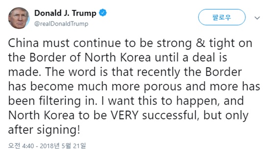 이날 트윗을 통해, 트럼프 대통령은 “(북.미 간에) 거래가 이뤄질 때까지, 중국은 북한과의 국경에 대해 계속 강력하고 엄격해야 한다”고 밝혔다. “최근 들어 (북.중) 국경에 구멍이 뚫리고 더 많은 것들이 흘러들어간다는 말이 있다”고 덧붙였다.