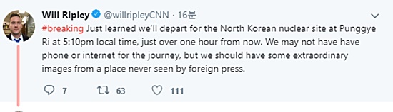 22일부터 원산 갈마초대소에 머물고 있는 윌 리플리 <CNN> 기자는 23일 오후 트윗을 통해 “오후 5시 10분에 풍계리 핵실험장으로 떠난다고 방금 통보받았다”고 밝혔다. 실제 숙소를 떠난 시간은 6시경으로 확인됐다.