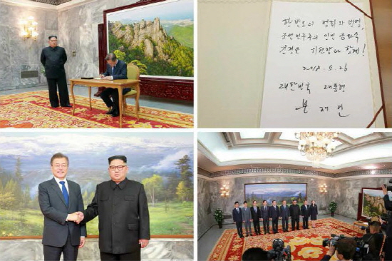 또한 문 대통령이 통일각 방명록에 “한반도의 평화와 번영, 조선민주주의인민공화국 김정은위원장과 함께! 2018.5.26 대한민국 대통령 문재인”이라고 서명했다고 전했다.