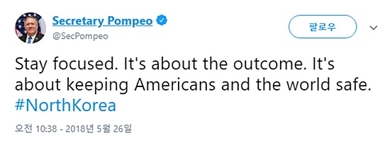 폼페이오 장관은 두 차례 방북해 김정은 위원장을 만나 북미정상회담 날짜와 장소를 확정했고, 트럼프 미국 행정부에서 북미정상회담 준비를 실무적으로 관장하는 인사다.