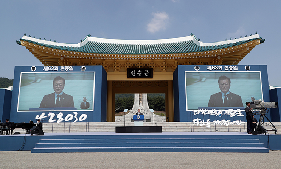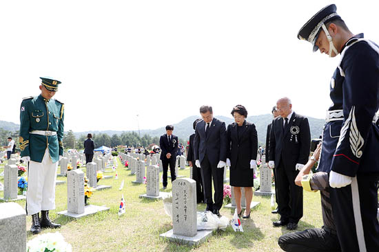 문재인 대통령은 제63회 현충일을 맞아 6일 국립 대전현충원을 찾아 추념식을 갖고 총 428,030명이 안장된 10개의 국립묘지에 대통령 명의의 조화를 보냈다.