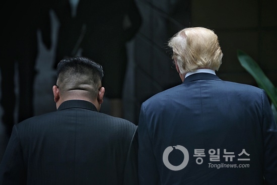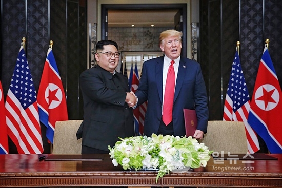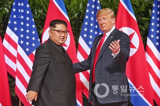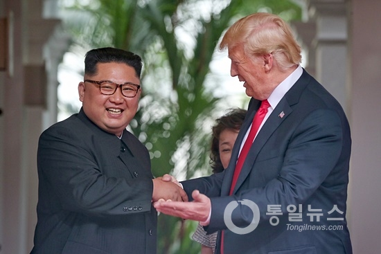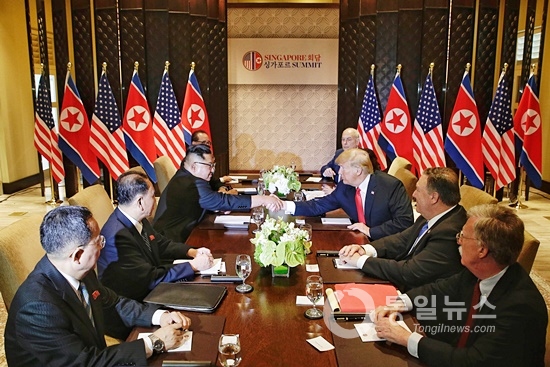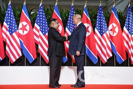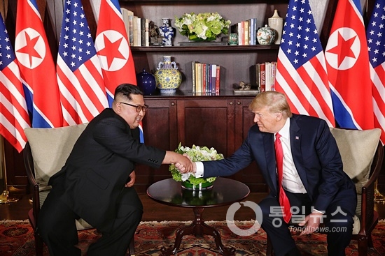 북한 김정은 국무위원장과 미국 도널드 트럼프 대통령이 12일 싱가포르 센토사섬 카펠라 호텔에서 만났다. 북한과 미국이 70년 적대관계를 청산하고 평화의 문을 여는 순간이었다.