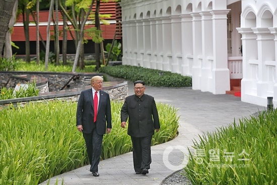 ▲ 70년 과거를 걷어내고 북미 정상은 새로운 평화의 길로 함께 걷기 시작했다. [사진제공-싱가포르 정보통신부]