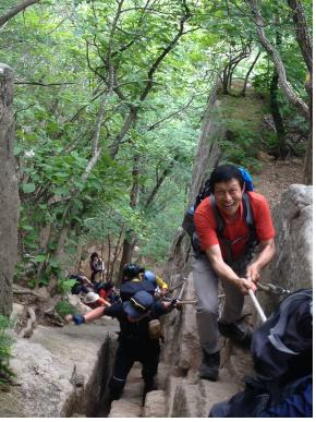 험한 코스를 먼저 올라 다른 대원들이 도착하기를 기다리며 오르는 대원들의 모습을 사진으로 남겨 주기위해 휴대전화를 꺼내들고 기다리니 산악대장께서 역시나 제일 먼저 도착하시고 다른 대원들도 차례로 올라온다. 마지막은 항상 그렇듯이 후미대장께서 환한 미소로 올라온다.