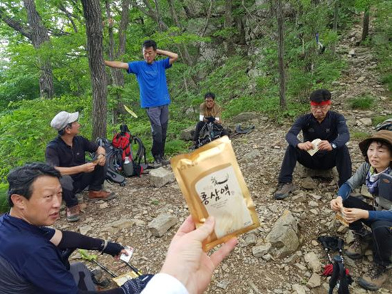 너덜바위로 되어있는 마지막 내리막길을 앞두고 산악대장께서 대원들의 원기 회복을 위해 지난 6.15산악회 체육대회에서 축구우승 상품으로 받은 홍삼 엑기스를 모든 대원들에게 나눠 준다.