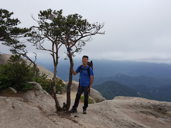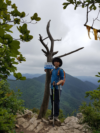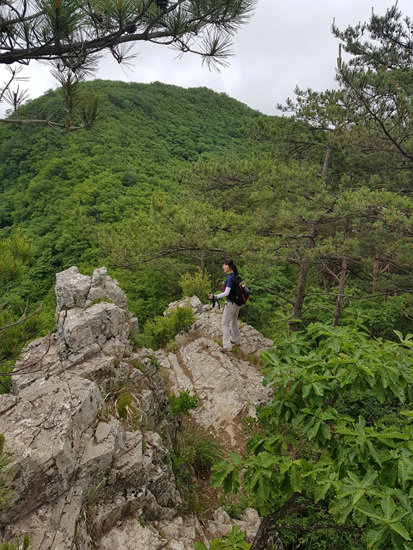 다른 산행팀들보다 한 발 앞서 산행을 시작하여, 마을 입구를 지나 산길로 접어드는 입구엔 ‘백두대간 희양산’을 알리는 표지석이 우리 일행을 반긴다. 어제 밤 사이 내린 비의 영향인지 바람은 시원한 느낌이지만 몸에서는 땀이 줄줄 흘러내리기 시작할 즈음, 중턱에서 잠깐의 휴식과 함께 이석화 대원이 준비한 얼음 슬러시처럼 시원한 과일은 언제 그랬냐는 듯이 나오던 땀을 식혀준다.