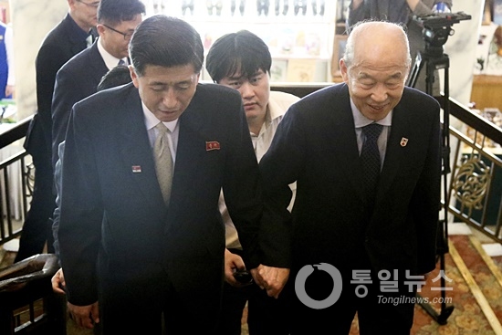 참, 저는 박용일 단장 이렇게 뵙고 환영의 말씀을 듣고 회담이 잘 되리라 생각한다. 제가 이 우리 대표단들, 나보다 나이가 퍽 젊은 사람들을 데리고 왔는데, 내가 88년 6월 10일 날 우리 조국에 처음으로 발을 디딜 때, 그때도 생각이 나고 회담 잘 될 겁니다. 열렬한 환영 대단히 감사하다.