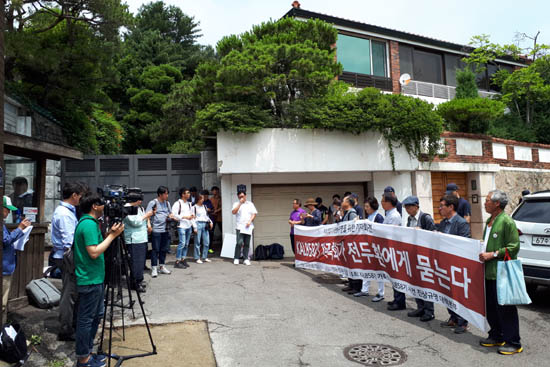 기자회견이 열린 ‘서울 서대문구 연희로27다길 10-8’ 전두환 집 앞 골목길은 기자회견 참석자들과 경비인력, 취재진으로 붐볐고, 전두환 집 대문은 굳게 닫혀 있었다.