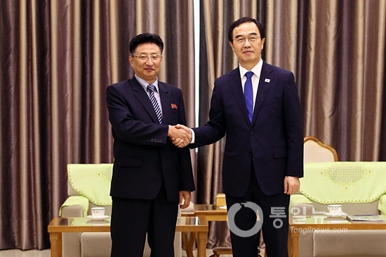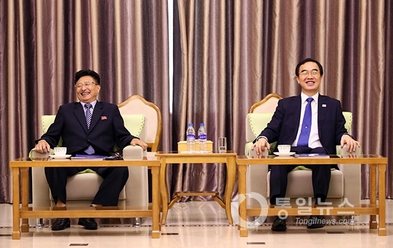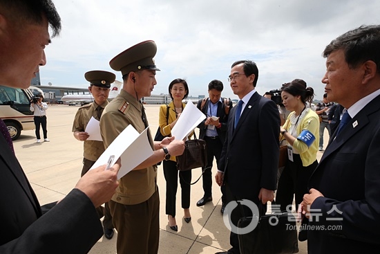 11년 만에 평양 땅을 밟은 조명균 통일부 장관을 북측 원길우 체육성 부상이 맞이했다.
