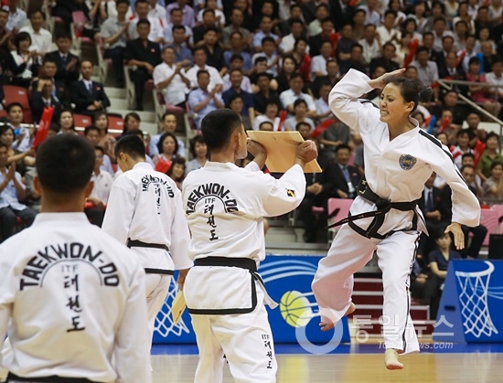 ▲ 남북통일농구경기 여자경기가 끝난 뒤 남자경기에 앞서 태권도시범이 펼쳐졌다. [사진-평양 사진공동취재단]