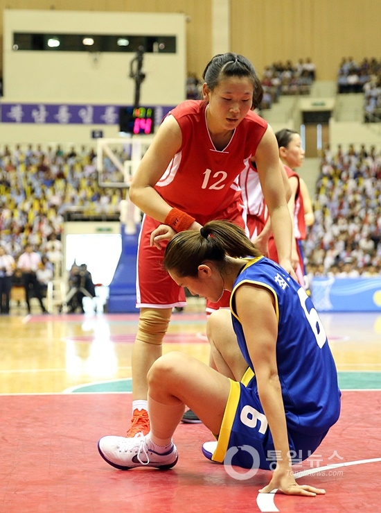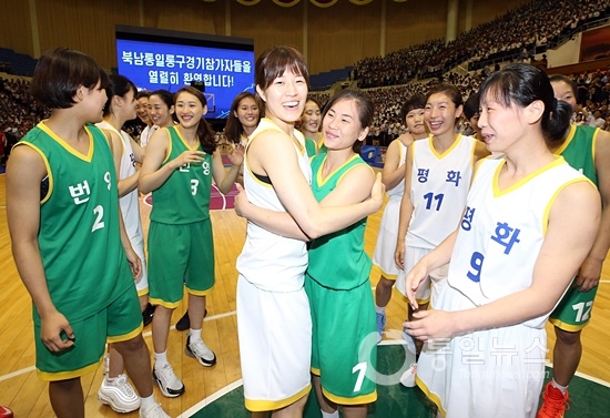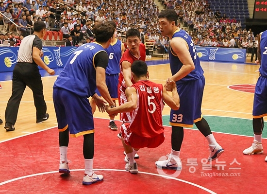 남북통일농구경기가 5일 오후 평양 류경정주영체육관에서 열렸다. 15년 만에 만난 남북 농구선수들은 마지막 경기를 치르면서 “우리는 한민족”임을 재확인했다.
