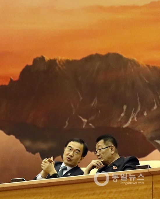 ▲ 조명균 통일부 장관과 최휘 국가체육지도위원회 위원장이 대화를 나누는 모습. [사진-평양 사진공동취재단]