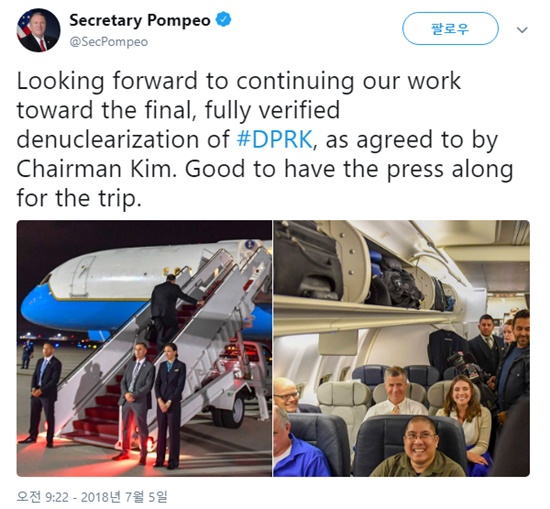 5일(현지시간) <ABC> 방송에 따르면, 헤더 노어트 국무부 대변인과 알렉스 웡 동아태 부차관보, 성김 대사와 앤드루김 센터장 등이 폼페이오 장관을 수행하고 있다. 국무부를 출입하는 기자들도 동행 취재 중이다.