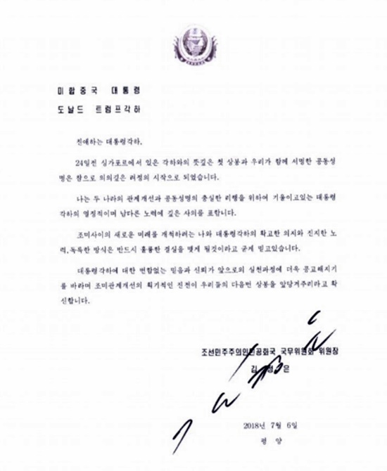 “미합중국 대통령 도날드 트럼프 각하” 앞으로 보낸 친서는 한글본과 영문본 각 1통씩이다. “조선민주주의 인민공화국 국무위원회 위원장 김정은 2018년 7월 6일 평양”으로 끝나고, 김정은 위원장의 친필 서명이 있다.