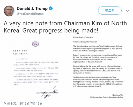 도널드 트럼프 미국 대통령이 12일(현지시간) 트위터 계정을 통해 “북한 김(정은) 위원장의 아주 멋진 친서”를 전격 공개했다. 지난 6~7일 방북했던 마이크 폼페이오 국무장관이 김영철 노동당 부위원장을 통해 전달받은 것이다.