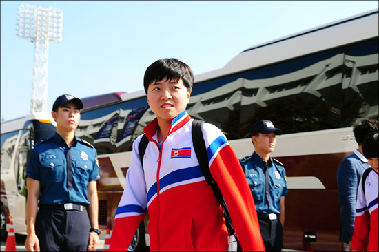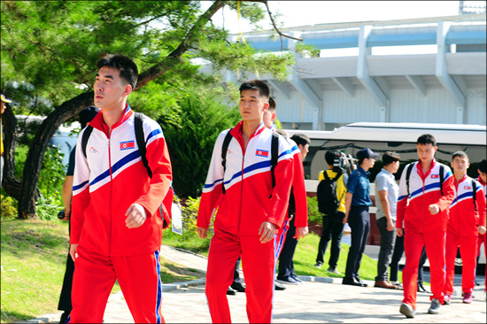 대회 참가를 위해 15일 방남, 대회가 열리는 대전에 도착한 북측 선수들은 숙소인 유성호텔에서 하룻밤을 묵은 후 16일 오전 9시 경 한밭체육관에 도착했다.