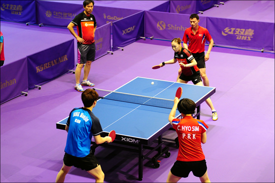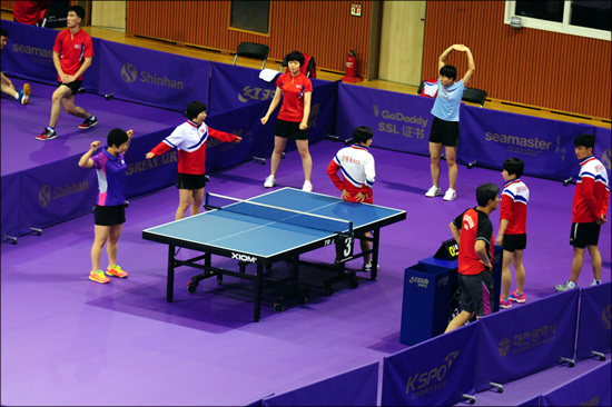 오전 9시부터 시작된 연습에는 남북 단일팀 경기를 위해 남측의 선수들도 함께 했다. 남과 북은 이번 코리아오픈에 남녀 복식과 혼합복식에서 단일팀을 구성하기로 했다.