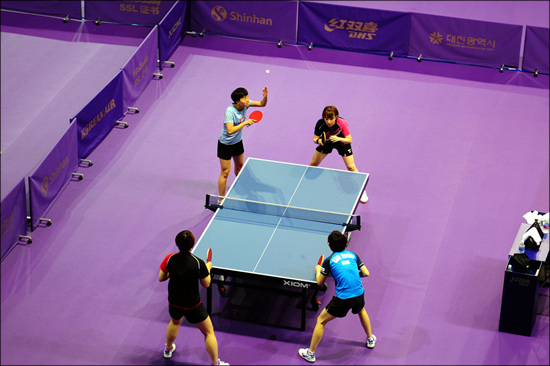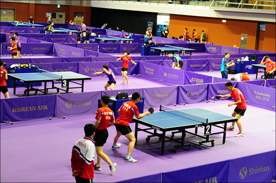 17일부터 시작되는 '2018 코리아오픈 국제탁구대회(7.17~22, Daejeon)'를 위해 남과 북의 탁구 선수들이 대전 한밭체육관에서 열띤 연습을 하고 있다.