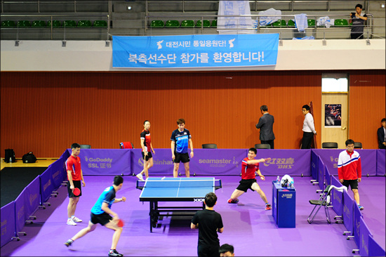 남북 선수들의 연습이 진행되는 동안 한밭체육관 응원석에는 ‘북측 선수단 참가를 환영합니다’, ‘우리는 하나다’ 등의 응원 현수막이 내걸렸다.