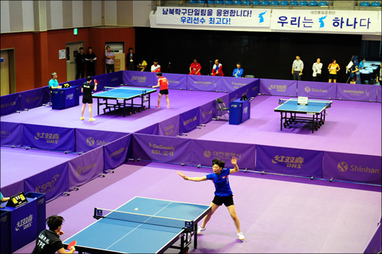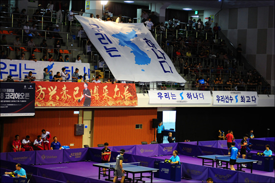 특히 처음으로 코리아오픈 탁구대회를 참석하는 북측 선수들을 비롯해 남북선수들을 응원하기 위한 통일응원단이 대규모로 응원전에 본격 돌입했다.