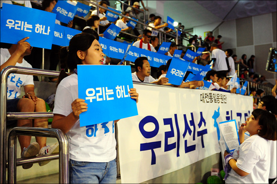 6.15공동선언실천 남측위원회 대전본부와 우리겨레하나되기대전충남운동본부가 중심이 된 대전지역 통일단체들이 모집한 통일응원단은 ‘우리는 하나’가 씌여진 흰색 티셔츠를 입고, 한반도기를 들고 응원에 나섰다. 이들은 북측 선수를 비롯해 남과 북 선수들이 경기를 할 때마다, “우리 선수 잘한다”, “우리는 하나다”, “우리 선수 최고다” 등을 함께 외쳤다.