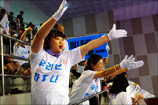대전시민통일응원단은 100여명으로 구성됐다. 이들은 ‘우리는 하나’가 적힌 흰색 티셔츠를 입고 한반도기를 손에 든 채 “코리아! 이겨라! 우리는 하나다!”,“통~일조국” 등의 구호를 연신 외쳐댔다.