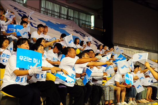 대전시민들로 구성된 공동응원단은 한반도기를 흔들며 "힘내라 힘내라, 코리아 힘내라"라는 구호를 연신 외쳤다. 단일팀과 남한선수를 모두 응원할 수밖에 없는 상황인 것. 남한조 이상수 선수의 스매싱이 단일팀의 테이블에 꽂히면 응원석에서는 환호와 아쉬움의 탄성이 동시에 터져 나왔다. 북한 최일 선수의 멋진 드라이브가 성공할 때도 상황은 마찬가지였다.