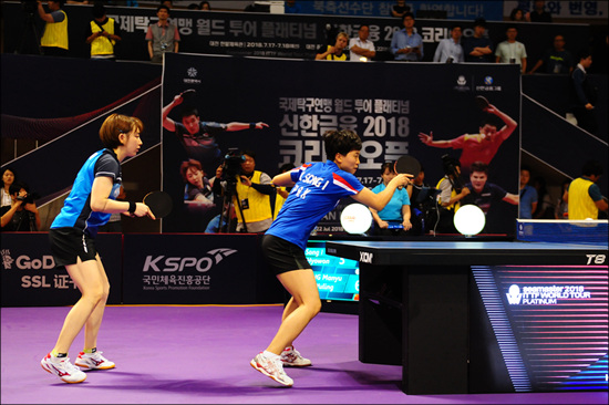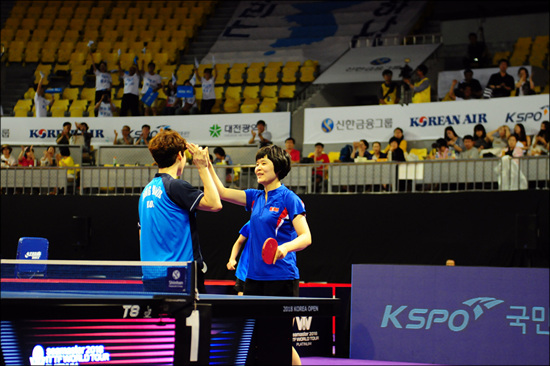 '2018코리아오픈 세계탁구대회'가 지난 17일부터 오는 22일까지 대전 한밭체육관과 충무체육관에서 열리고 있는 가운데, 이번 대회 최고 인기팀이었던 서효원(남)-김송이(북) 남북 여자복식 단일팀이 아쉽게 16강에서 탈락했다.