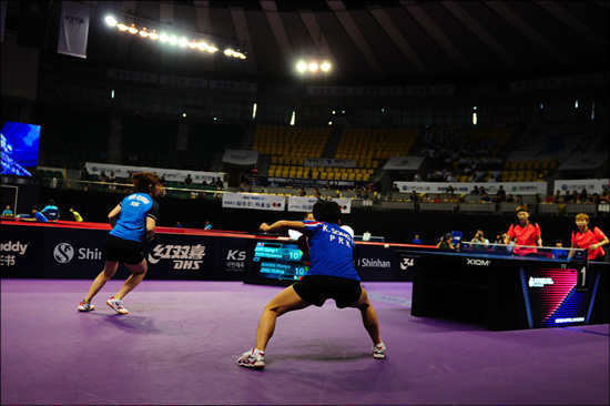 19일 오후 충무체육관 1번 테이블에서 중국의 왕만위(WANG Manyu)-주위링(ZHU Yuling)조와 8강 진출을 놓고 격돌한 서효원-김송이 조는 첫세트 부터 듀스 접전을 벌이면서 치열한 공방전을 벌였다.