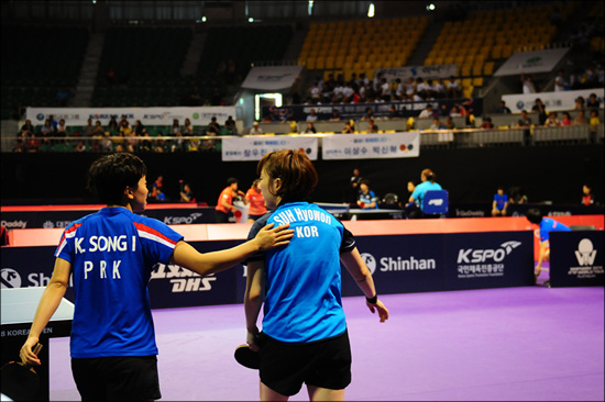 하지만 이날부터 본선경기가 치러지는 충무체육관에는 4개 테이블만이 마련됐고, 남북 단일팀 또는 남한과 북한 선수들의 경기가 각각 진행되면서 관중들은 한마음으로 남북선수와 단일팀을 응원하고 있다.