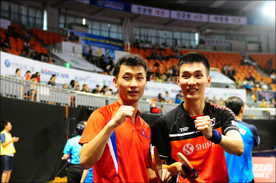 반면, 혼합복식 단일팀 장우진(남)-차효심(북)조와 남자복식 단일팀 이상수(남)-박신혁(북)조는 16강 경기에서 승리해 8강에 진출했다.