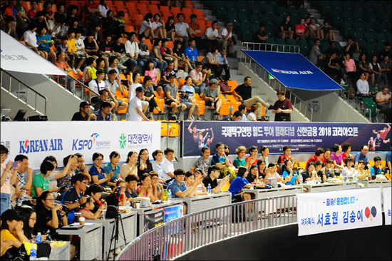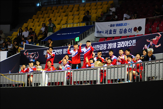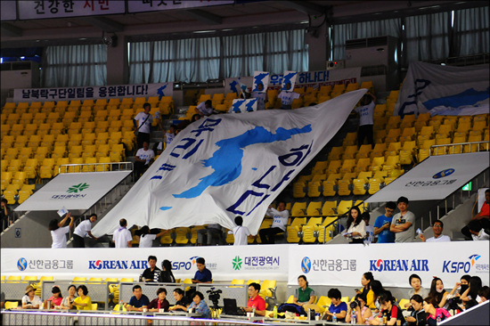 한편, 남북 단일팀의 경기가 이어지면서 관중들의 응원소리도 점점 커지고 있다. 전날까지 한밭체육관에서 진행된 예선에서는 경기장 내 14개의 테이블에서 경기 동시다발로 진행되면서 응원이 한 경기로 집중되지 못했다.