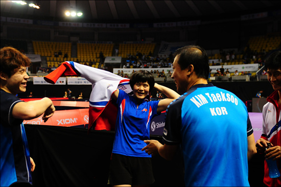 혼합복식 남북 단일팀으로 출전했던 장우진(남)-차효심(북) 선수가 8강에서 승리를 거두고 단일팀 훈련 지휘를 맞고 있는 김택수 한국 남자대표팀 감독에게 다가오자 김택수 감독이 두 선수에게 한 말이다. 두 선수도 김택수 감독의 말이 맞다며 맞장구를 쳤고, 오늘 경기가 만족스러운지 환하게 웃음을 지었다.