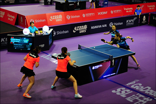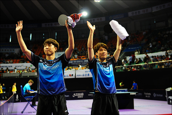 남북 단일팀 이상수(남)-박신혁(북)조는 20일 오후 대전 한밭체육관에서 홍콩 호콴킷-왕춘팅 조와 남자복식 4강전을 치렀다.