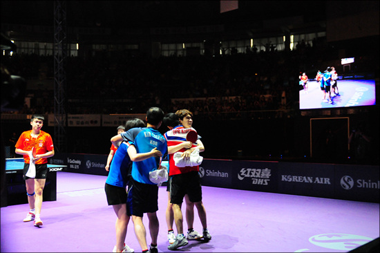 한국의 아들 장우진 선수의 포효소리는 높았고, 북한의 딸 차효심은 펄쩍 뛰어 올랐다. 관중들은 아낌없는 박수를 보내며, 남북 남매의 우승을 축하했다. 객석에서는 '우리는 하나다'를 외치는 소리가 흘러나왔다.