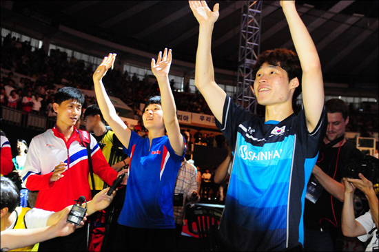 장우진-차효심 선수는 코트를 방방 뛰며 기뻐했다. 관중들도 일제히 '잘했다'를 외치며 축하했다. 관중석에서 지켜보던 북한 선수들도 모두 일어나 있었다. 두 선수는 관중석을 향해 두 손을 들어 인사했다.