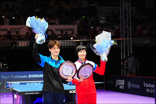 '2018코리아오픈 국제탁구대회'에 출전한 남북 단일팀 남녀 혼합복식 장우진(남)-차효심(북)조가 21일 오후에 열린 결승전에서 중국의 왕춘친-순잉샤 조를 세트스코어 3대 1로 이기고 금메달을 따냈다.
