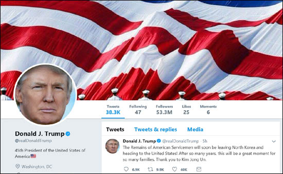 트럼프 대통령은 이날 트위터를 통해, “미군 유해는 곧 북한을 떠나 미국으로 향한다!”며 “오랜 세월이 지나, 수많은 가족에게 매주 중요한 순간이 될 것”이라고 강조했다.