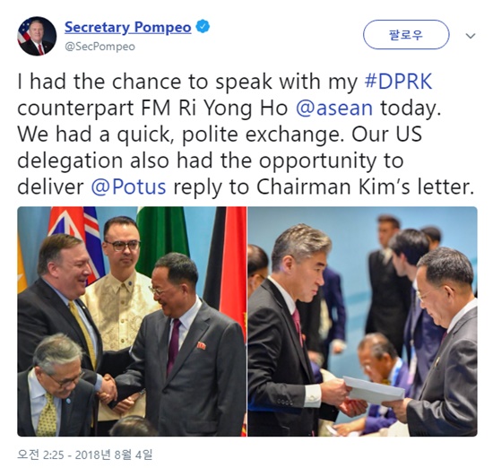 싱가포르에서 열리는 아세안 관련 외교장관회의에 참석 중인 폼페이오 장관은 이날 트윗을 통해 “오늘 아세안에서 북한 측 카운터 파트인 리용호 외무상과 얘기할 기회가 있었다”면서 이같이 알렸다.