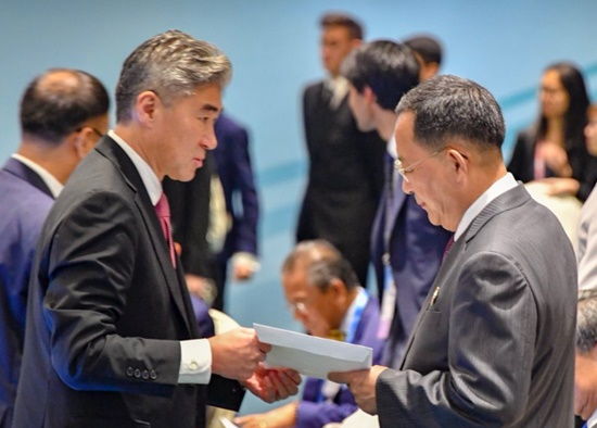 그는 아세안지역안보포럼(ARF)에서 리용호 외무상과 밝게 웃으며 악수하는 모습, 성김 주필리핀 미국 대사가 리 외무상에게 트럼프 대통령의 답신으로 보이는 서류 봉투를 전하는 모습을 담은 사진을 트윗에 첨부했다.