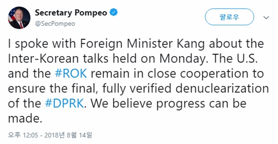 이날 트윗을 통해, 폼페이오 장관은 “강(경화) 외교장관과 월요일 개최된 남북회담에 대해 얘기했다”면서 “미국과 한국은 북한의 최종적이고 완전하게 검증된 비핵화를 보장하기 위해 긴밀하게 협력하고 있다”고 밝혔다.
