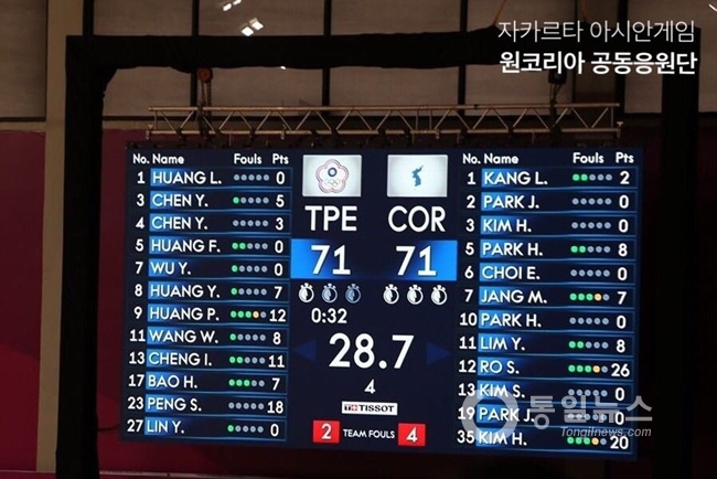 현지시간 17일 오전 10시, 여자농구 남북단일팀 경기현장에서는 서울에서 온 남측응원단과 인도네시아 현지 교민 - 특히 남측, 북측 교민들이 모두 함께 응원을 펼치는 훈훈한 장면이 연출됐다.