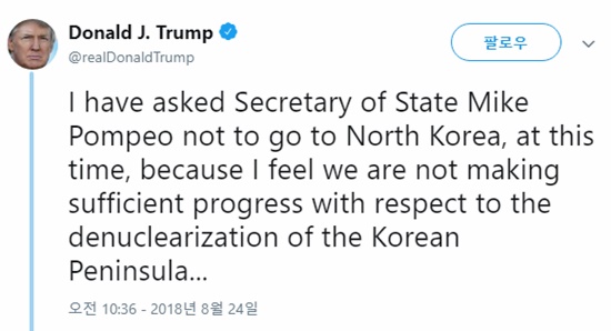 24일자 트윗을 통해, 트럼프 대통령은 “나는 폼페이오 국무장관에게 이번에 북한에 가지 말라고 요청했다”면서 “한반도 비핵화 관련해 우리가 충분한 진전을 만들어내지 못했다고 느꼈기 때문”이라고 밝혔다.