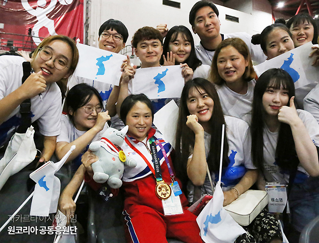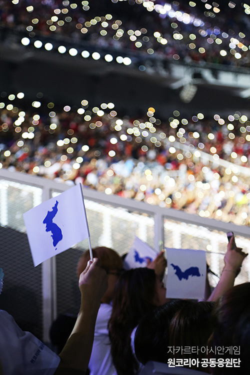 | 얼마 전 팔렘방에서 카누 남북단일팀이 금메달을 목에 걸며 단일기가 시상대에 올랐다. 선수들은 아리랑을 함께 부르며 울고 웃었다. 국제대회에는 ‘코리아’의 메달이 공식 기록된다. 아시안게임 현장에서 남도 북도 아닌 ‘코리아’를 응원한 사람들. 6.15남측위원회가 한겨레통일문화재단등과 주최한 2018 아시안게임 ‘원코리아 공동응원단’의 활동 소감을 전한다. / 편집자 주 |