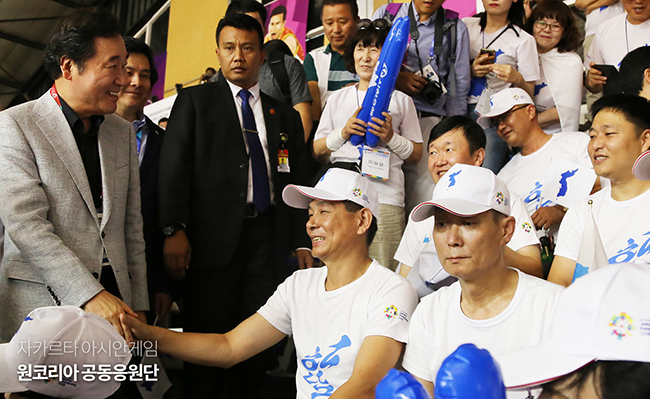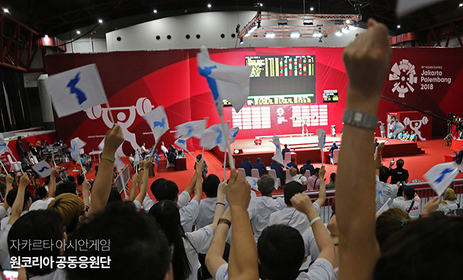 20일 역도경기장. 북측에서 여자 48kg 리성금 선수, 남자 56kg 엄윤철 선수가 출전했다. 경기장에는 인도네시아 응원단이 가득했다. 그렇지만 리성금 선수와 엄윤철 선수가 등장했을 때만큼은 경기장 전체가 떠나가라 선수들의 이름이 울려 퍼졌다.